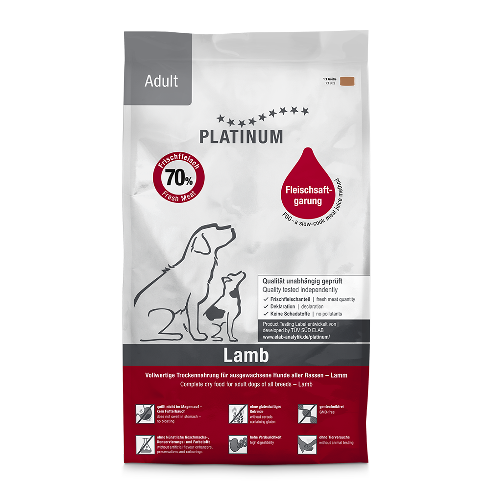 PLATINUM adult lam og ris er et sundt komplet koldpresset hundefoder der sikre din hund alt det den har brug for, fodret er fremstillet af 70% fersk lammekød, det anvendte lammekød er godkendt til menneske føde.