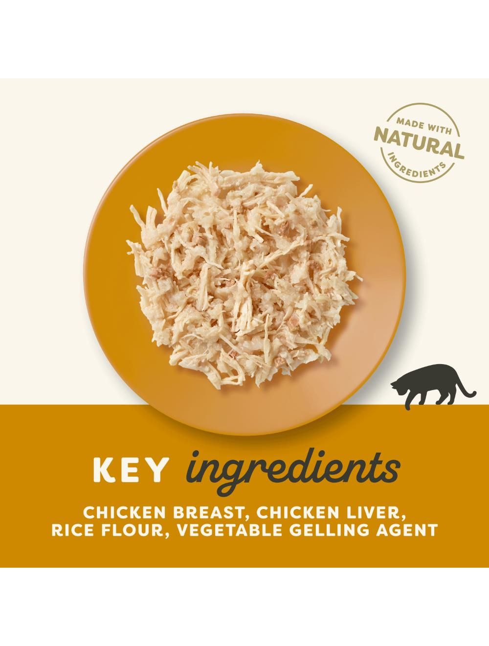 Kyllingebryst* 55%, Kyllingelever* 7%, Rismel*, Vegetabilsk geleringsmiddel.