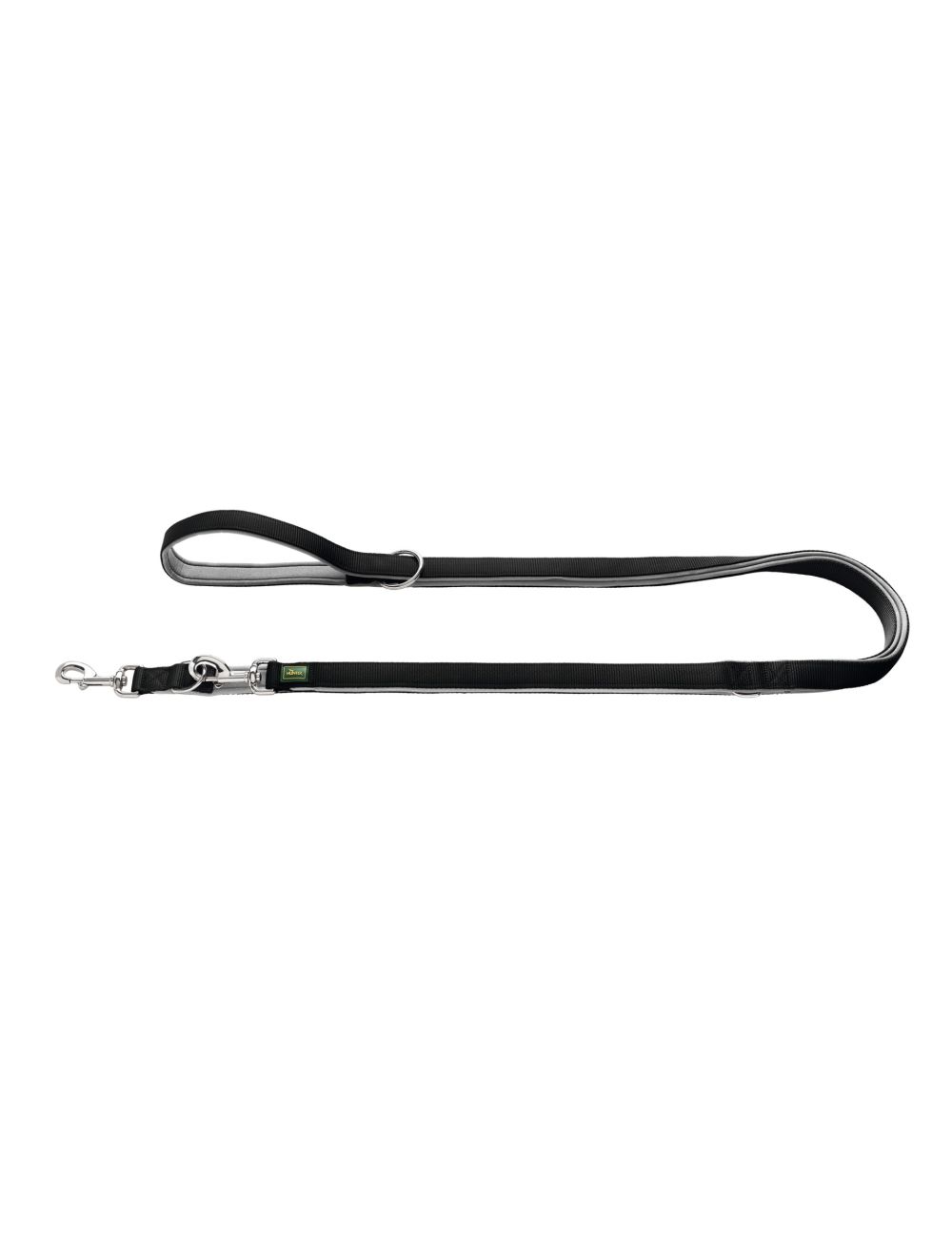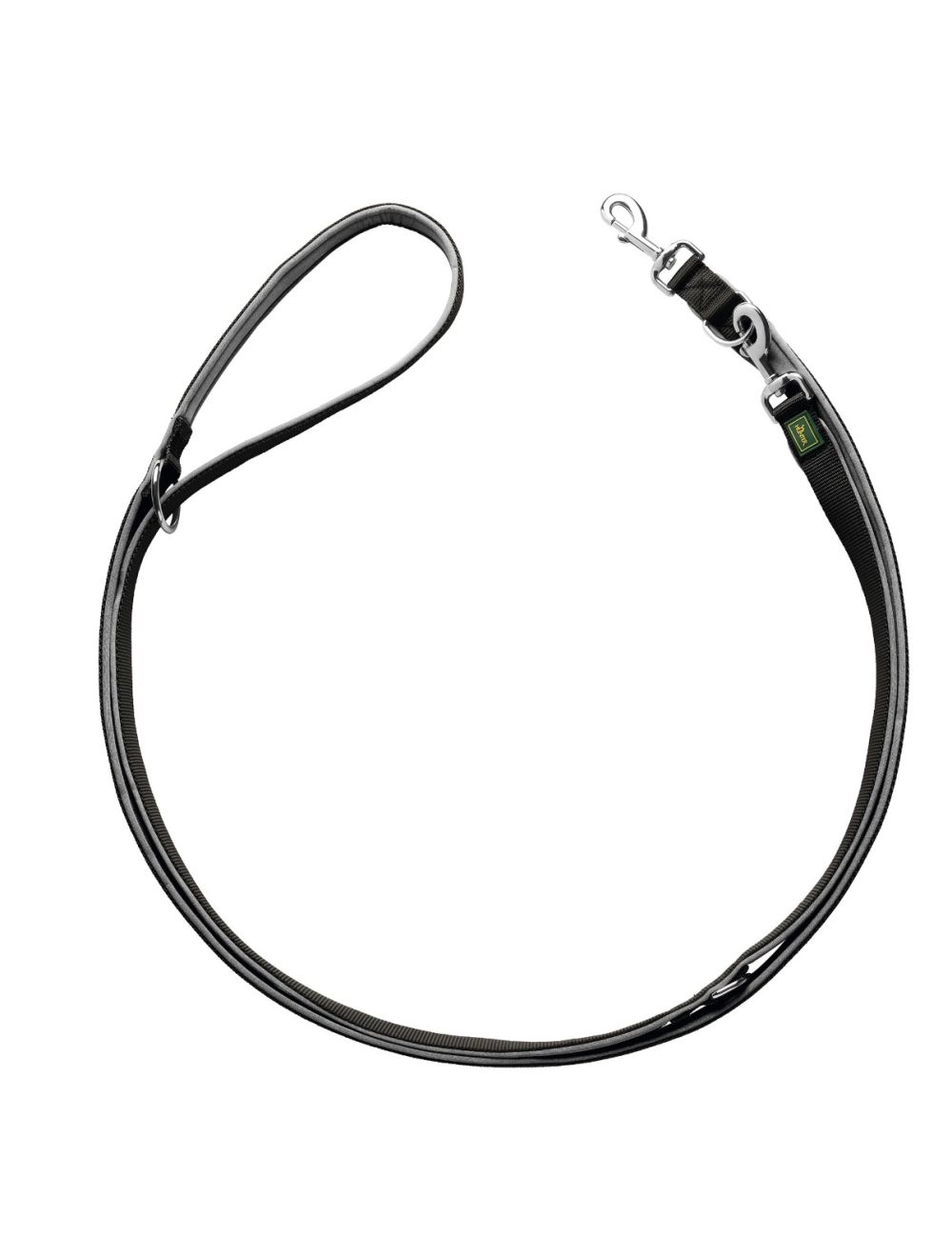Hundeline i sort/grå. Lavet af nylon/plast og neopren.