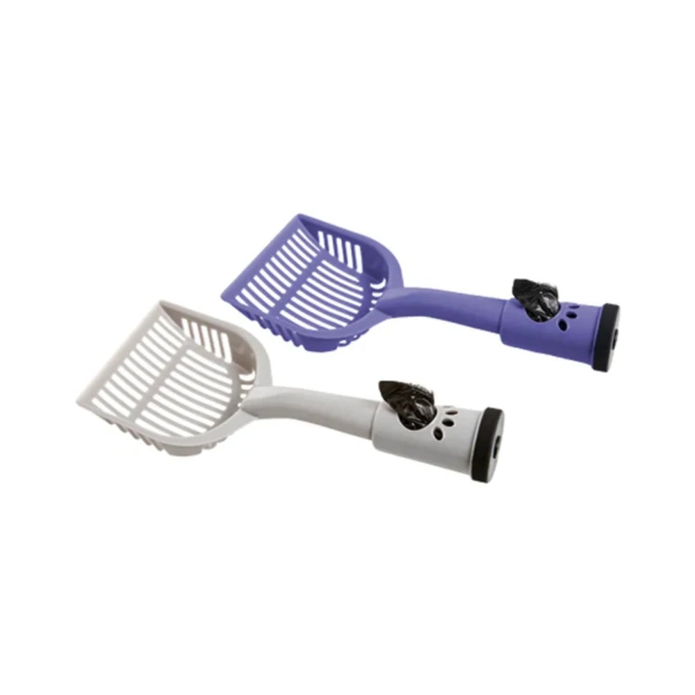 Praktisk 2-i-1 katteskovl med indbygget poseholder, så du nemt kan holde kattebakken ren uden rod. En rulle med 15 poser medfølger, så du kan komme i gang med det samme. Skovlen er fremstillet i holdbart plast og fås i assorterede farver. Perfekt til nem og hygiejnisk rengøring af kattebakken.