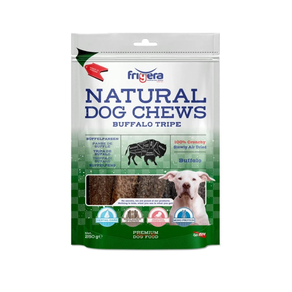 Frigera Natural Dog Chews bøffel kallun. Lækre sunde premium tyggesnacks bestående af 100% naturlige og skånsomt tørrede maver fra fritgående bøfler, der også anvendes til konsum. Disse dyr er opdrættet uden tildeling af antibiotika, steroider og hormoner, så det bliver næsten ikke mere naturligt.