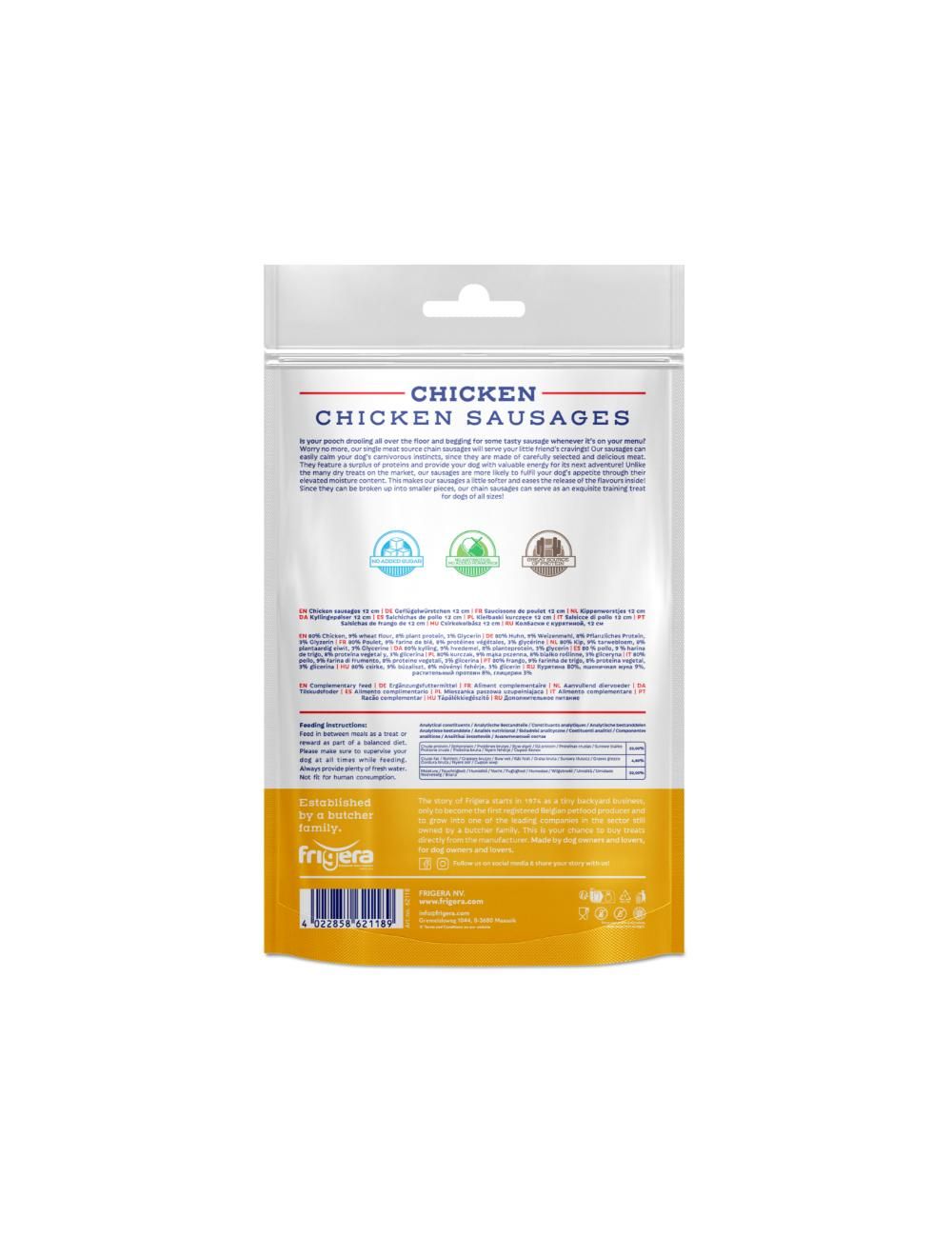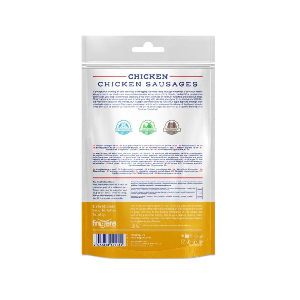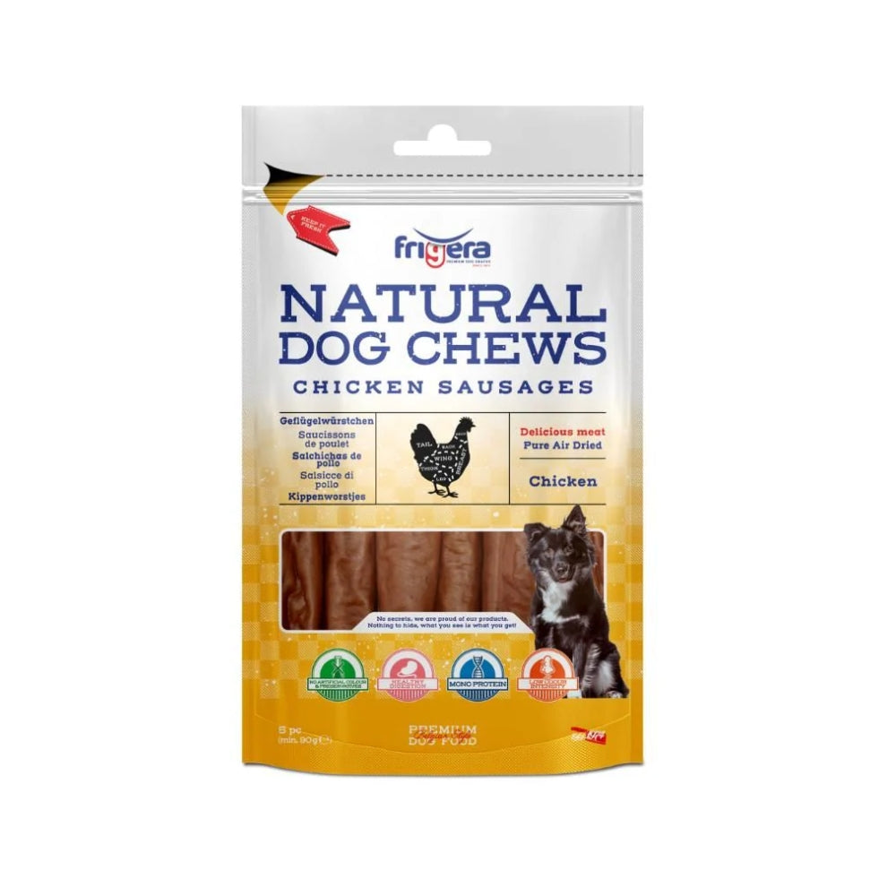 Frigera Natural Dog Chews Chicken Sautage. Lækre kyllingepølser der er lavet af omhyggeligt udvalgt og lækkert kød. De har højt indhold af proteiner og giver hunden værdifuld energi til dens næste eventyr. I modsætning til de mange tørre godbidder på markedet er disse pølser mere tilbøjelige til at tilfredsstille hundens appetit på grund af deres forhøjede fugtighedsindhold. Dette gør pølserne lidt blødere og letter frigivelsen af smagene indeni. Da pølserne let kan opdeles i mindre stykker, er de ideelle som en udsøgt træningsgodbid til hunde i alle størrelser.