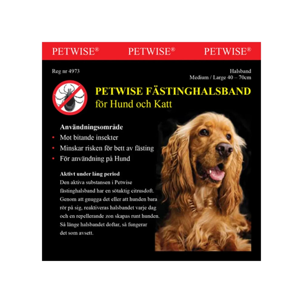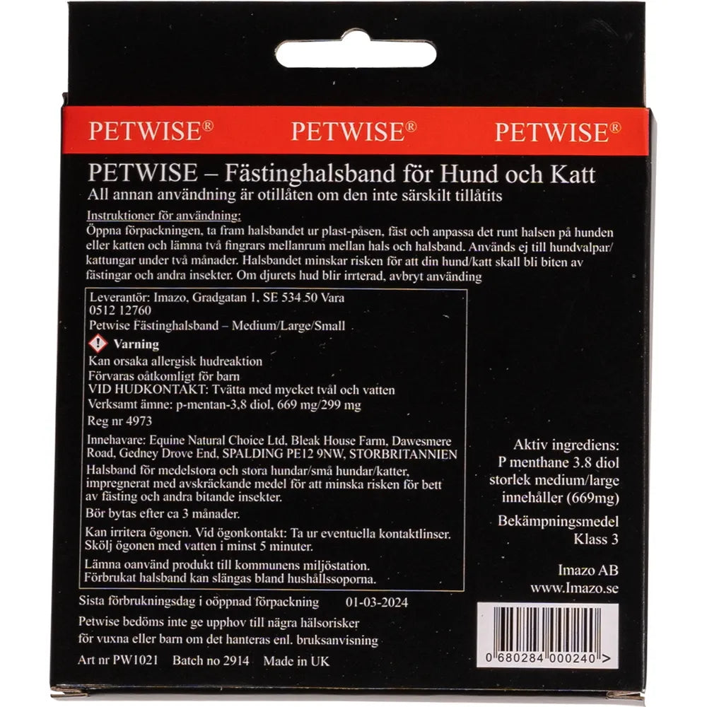 Aktiv i en længere periode Det aktive stof i Petwise Flåthalsbånd har en sød citrusduft. Ved at gnide det eller blot gennem hundens/kattens bevægelser, reaktiveres halsbåndet hver dag og skaber en afvisende zone omkring hunden/katten. Så længe halsbåndet dufter, fungerer det som tilsigtet. Effektivitet En række videnskabelige artikler har i studier vist, at det aktive stof i Petwise Flåthalsbånd reducerer risikoen for at blive bidt af flåter og andre insekter. Denne velkendte og effektive olie - essentiel olie af citron-eukalyptus - anvendes og anbefales i dag i mange produkter til både dyr og mennesker for at afvise insekter. Petwise Udtalelse Petwise anses ikke for at udgøre nogen sundhedsrisiko for voksne eller børn, hvis det håndteres i henhold til instruktionerne. Denne vurdering er foretaget efter en sundhedsrisikovurdering af Petwise i overensstemmelse med etablerede principper. Fastgør omkring dyrets hals som et almindeligt halsbånd. Aktiveres ved gnidning eller blot gennem hundens/kattens bevægelser. Effektivt stof: PMD olie (p-Menthane 3,8-diol) findes i bladene på Eucalyptus Citriodora træet. Denne olie kaldes essentiel olie af citron-eukalyptus. Denne naturlige olie anvendes og anbefales til at afvise flåter og bidende insekter. Kan forårsage en allergisk hudreaktion Opbevares utilgængeligt for børn Ved hudkontakt: vask med rigeligt sæbe og vand