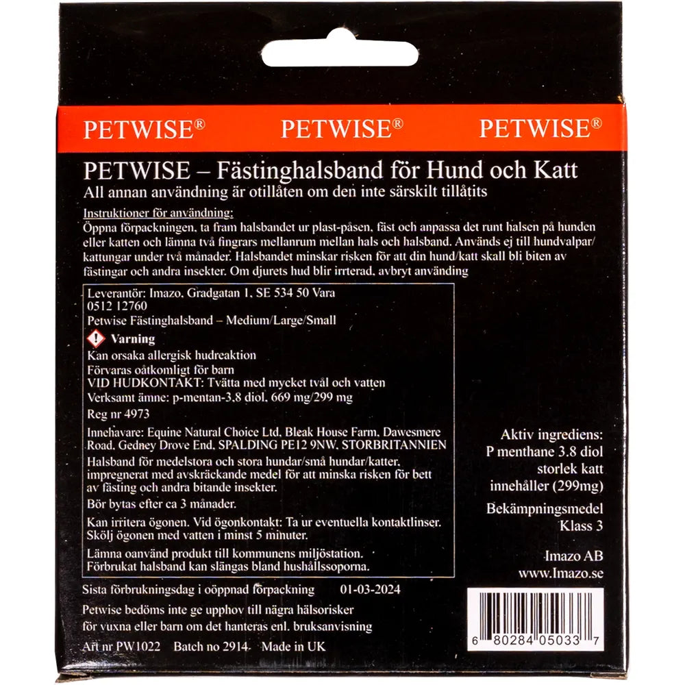 Aktiv i en længere periode Det aktive stof i Petwise Flåthalsbånd har en sød citrusduft. Ved at gnide det eller blot gennem hundens/kattens bevægelser, reaktiveres halsbåndet hver dag og skaber en afvisende zone omkring hunden/katten. Så længe halsbåndet dufter, fungerer det som tilsigtet. Effektivitet En række videnskabelige artikler har i studier vist, at det aktive stof i Petwise Flåthalsbånd reducerer risikoen for at blive bidt af flåter og andre insekter. Denne velkendte og effektive olie - essentiel olie af citron-eukalyptus - anvendes og anbefales i dag i mange produkter til både dyr og mennesker for at afvise insekter. Petwise Udtalelse Petwise anses ikke for at udgøre nogen sundhedsrisiko for voksne eller børn, hvis det håndteres i henhold til instruktionerne. Denne vurdering er foretaget efter en sundhedsrisikovurdering af Petwise i overensstemmelse med etablerede principper. Fastgør omkring dyrets hals som et almindeligt halsbånd. Aktiveres ved gnidning eller blot gennem hundens/kattens bevægelser. Effektivt stof: PMD olie (p-Menthane 3,8-diol) findes i bladene på Eucalyptus Citriodora træet. Denne olie kaldes essentiel olie af citron-eukalyptus. Denne naturlige olie anvendes og anbefales til at afvise flåter og bidende insekter. Kan forårsage en allergisk hudreaktion Opbevares utilgængeligt for børn Ved hudkontakt: vask med rigeligt sæbe og vand